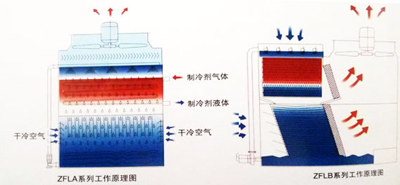 ZNX型蒸发式冷凝器以水和空气为冷却介质与盘管内的高温气态制冷剂进行热交换制冷剂由气态冷凝成液态。内部设水分配系统、根冷凝盘管组、填料热交换层、除水器等。外部设循环水泵、盆管侧面顶部设轴流风机。在轴流风机的作用下,内部成负压状态。工作时,冷却水由水分配系统在强动的风力下均匀地完全覆盖在盘管表面,高温气态制冷剂从盘管上部进入,被冷凝的液态制冷剂从管底都流出,在该过程中,高温制冷剂与盘管外的水、空气进行热交换,再借助风势,换热效果显著提高。冷却水和空气吸热后温度节别升高,部分冷却水气化形成水蒸气,蒸发带走大量的热量由风机吸走排入大气,同时热空气中的水分被除水器截止集水池中,没有被气化的高温冷却水流入填料热交换层被流经的空气带走热量使其冷却,经充分冷却后的冷却水流回集水池中供循环泵重新送入水分配系统继续循环工作。数失到大气中的水分由集水池内的浮球阀控制水位,给予及时补充。